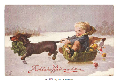 Among the postcards on the dachshund those depicting him with children are the most common and easy to find.
